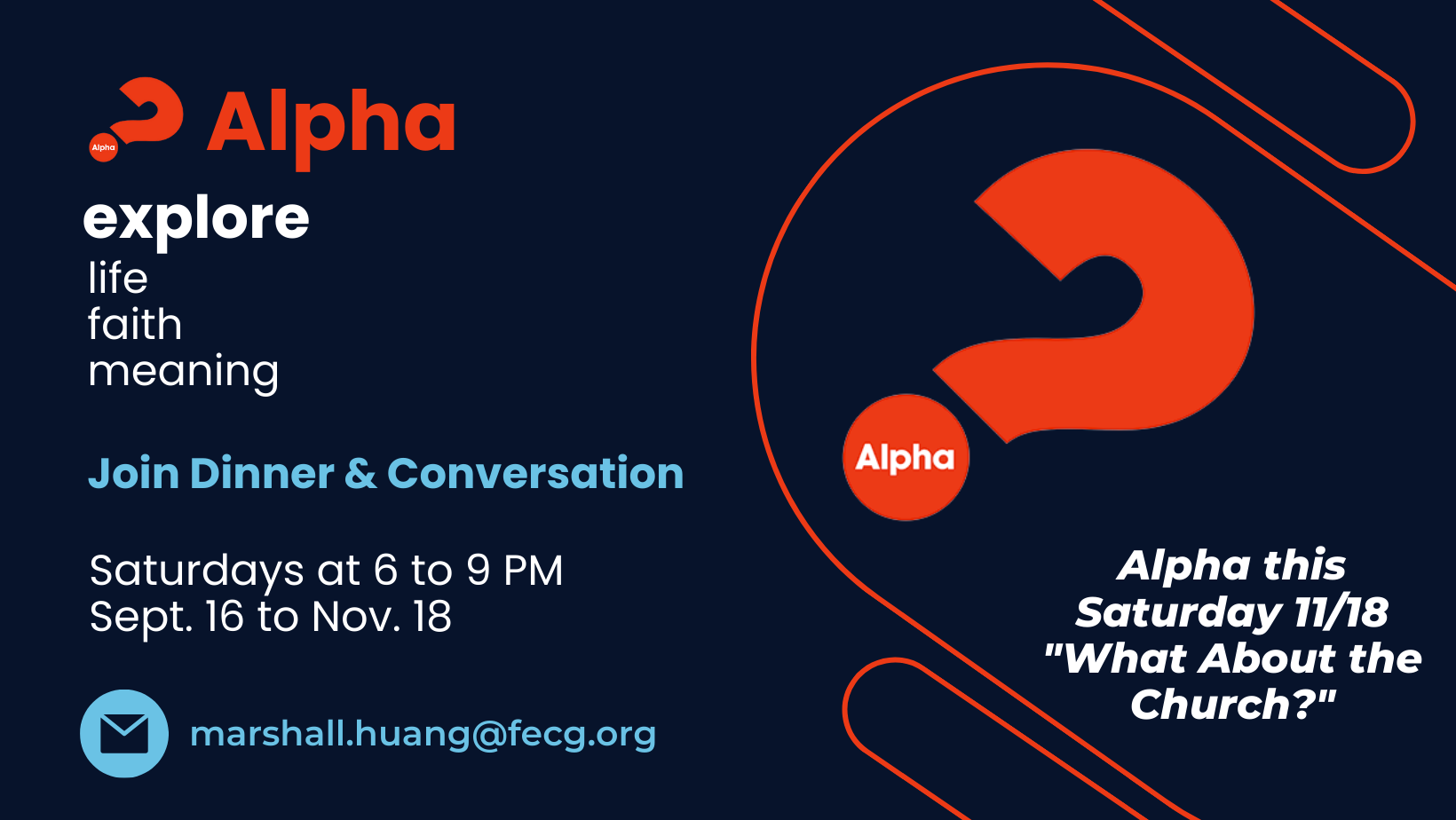 Alpha 2023 Saturday, September 16, 2023 6:00 PM Saturday, November 11, 2023 8:00 PM First Evangelical Church Glendale 522 West Broadway Glendale, CA, 91204 United States (map) Google Calendar ICS