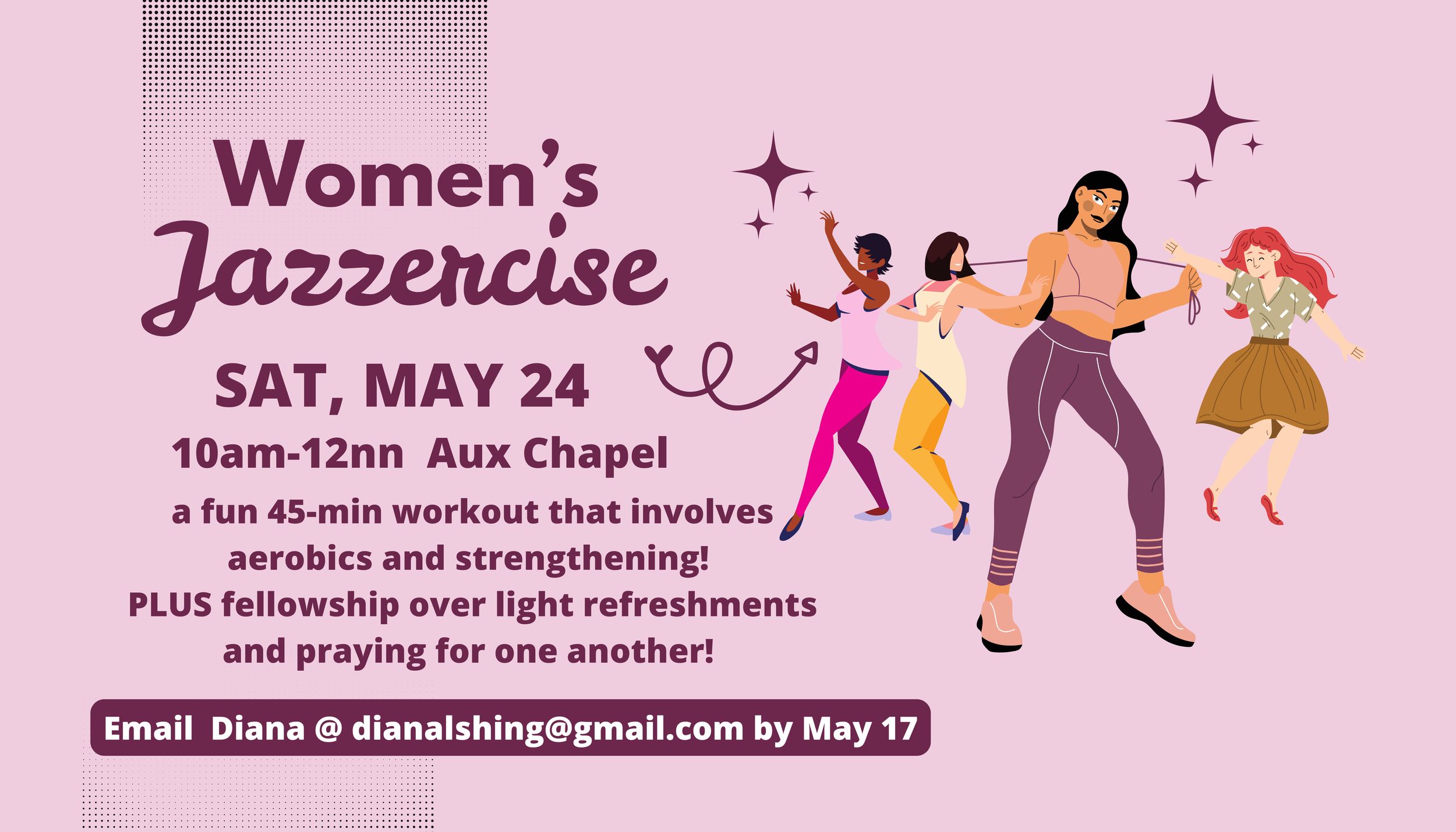 Come join us on Sat, May 24, 10am-noon in the Aux Chapel for a fun 45-min workout that involves aerobics and strengthening! After breaking a sweat, we will have a time to fellowship over light refreshments and pray for one another! You don't need to have any prior experience to join, this class is for anyone of any age interested! Just wear comfortable clothes and tennis shoes. Email dianalshing@gmail.com by May 17.