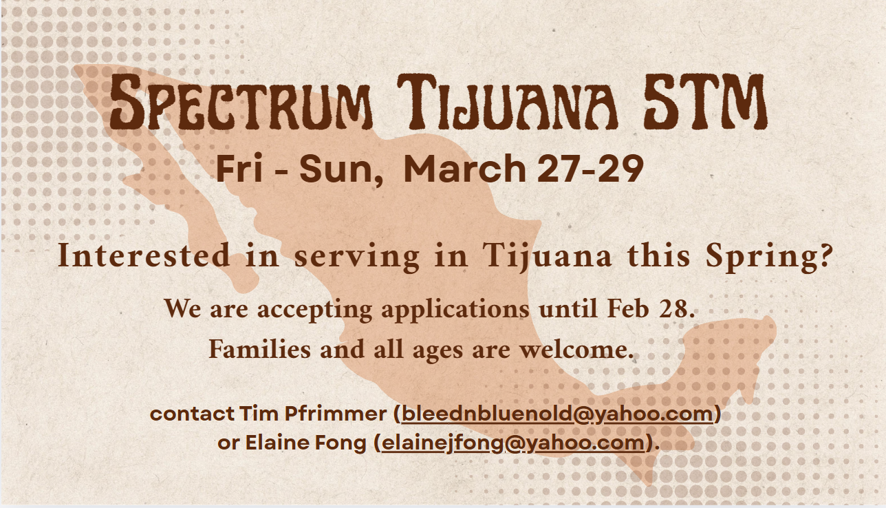 Short-Term Missions Trip - Spectrum Tijuana - Fri., Mar. 27 - Sun., Mar. 29 - We are accepting applications until Feb 28. Families and all ages are welcome. Questions? please contact Tim Pfrimmer (bleednbluenold@yahoo.com) or Elaine Fong (elainejfong@yahoo.com).